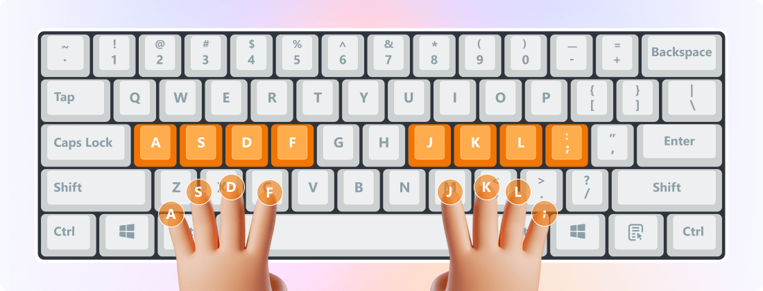8个手指依次按自然顺序放置到相邻的键位上,然后将两个拇指放置到空格键上。
