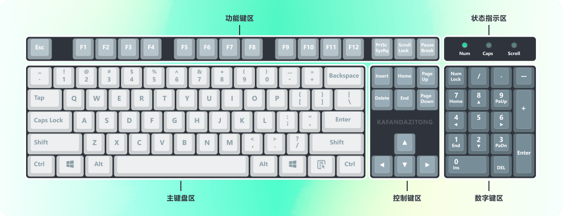 一般键盘分为「主键盘区」「控制键区」「数字键区」「功能键区」和「状态指示区」五个区