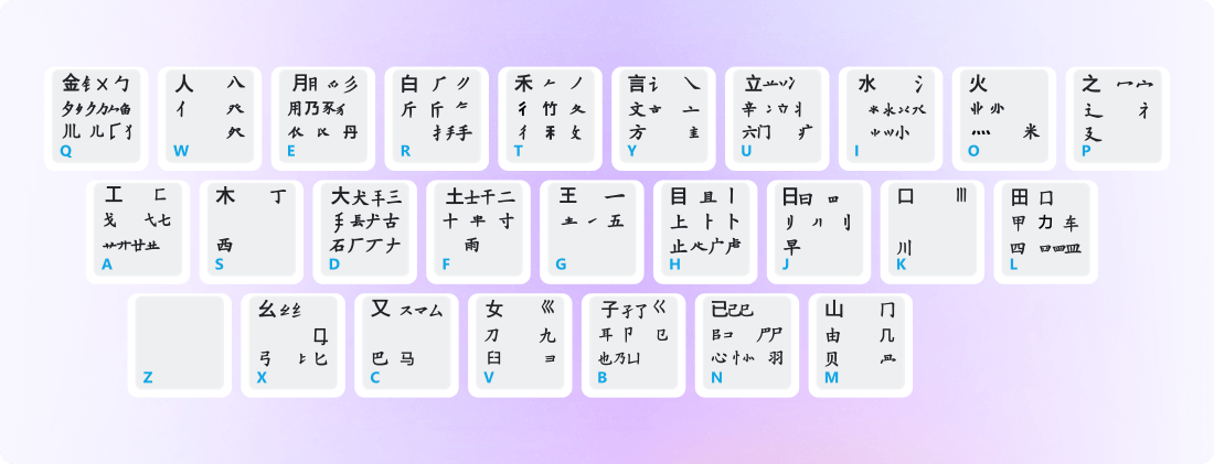 把组字能力很强,在日常文字中出现频率很高的字根,称为基本字根,这些基本字根均匀地分布在A~Y键位上。